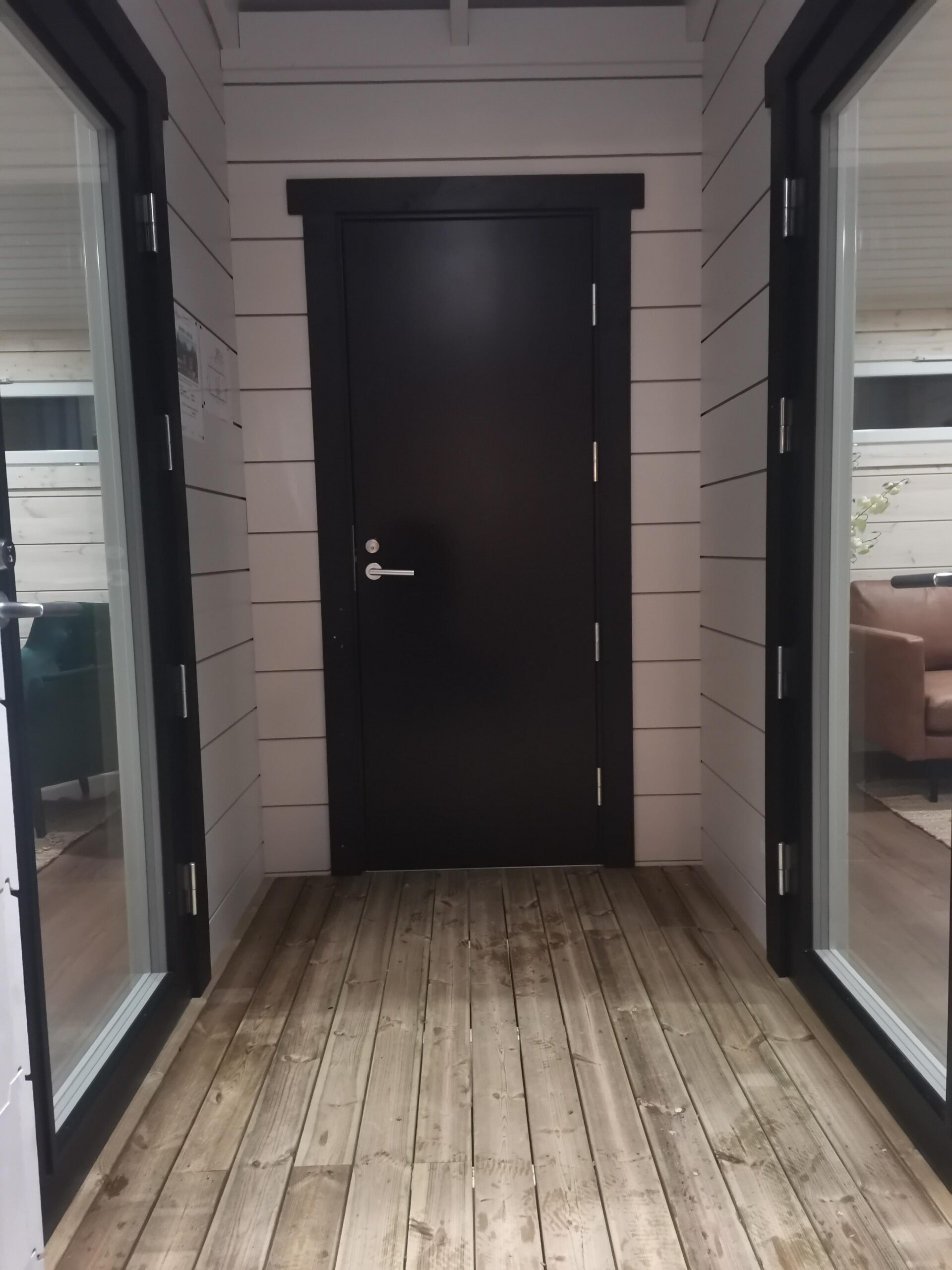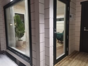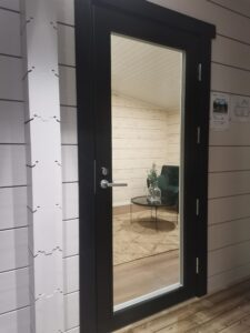 – дверные и оконные блоки со стеклом и переплётами с фурнитурой и наличниками 100мм,