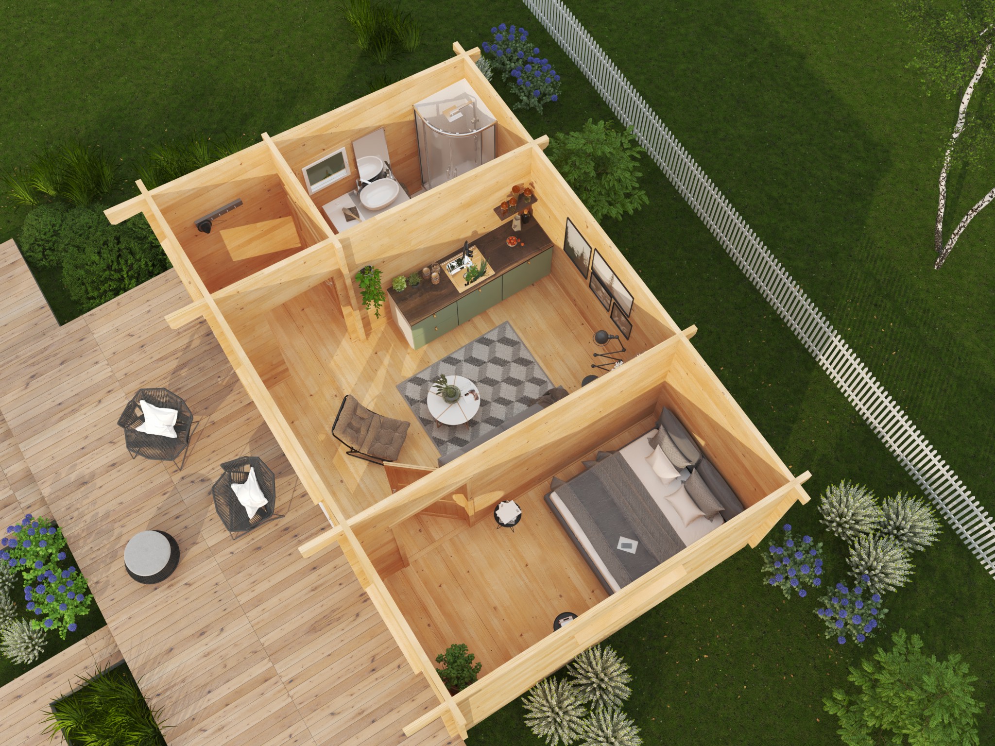 Особенно хочется отметить продуманность планировки и качество материалов. Общая площадь около 30 квадратных метров позволяет комфортно разместить всю семью, а высота потолков более 3 метров создает ощущение простора и свободы. Домик получился уютным и функциональным — здесь есть все необходимое для полноценного отдыха за городом.